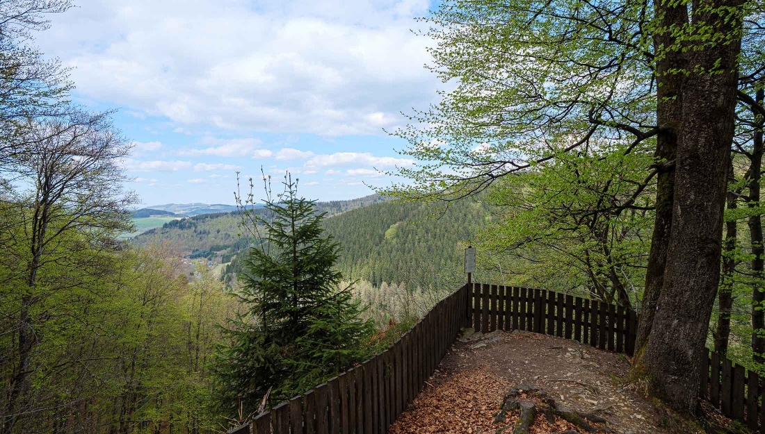 Unser Weg geht weiter und nach einem Bogen rechts hinab auf das Dach des Hollenhauses mit sehr schöner Aussicht. Ein Fußweg führt von dort bergab und wieder bergan. Nach einer Senke gehen wir rechts und wieder links und erreichen das Rotwildgehege und etwas weiter die Vogelstange für das alljährliche Schützenfest. Wir lassen die Vogelstange auf unserer rechten Seite liegen und folgen dem Pfad geradeaus und abwärts bis zu einem Wirtschaftsweg. Hier wenden wir uns links. An der folgenden Waldecke hat man einen sehr schönen Blick auf Bödefeld. Dort wurde Schutzhütten aufgestellt, um sich ein wenig auszuruhen und den Ausblick zu genießen.